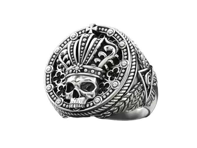 Rendered in 925 sterling silver, the surface keeps a clear, honest glow. King skull ring. mortality and the fleeting nature of time. rebirth. courageous honesty. Lines resolve with clarity; the piece reads as statement and whisper at once.