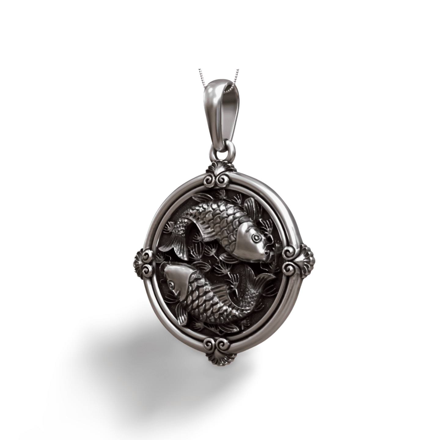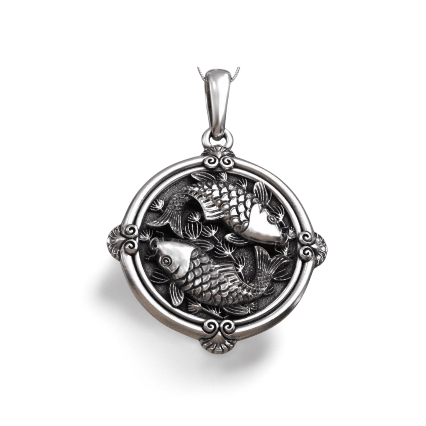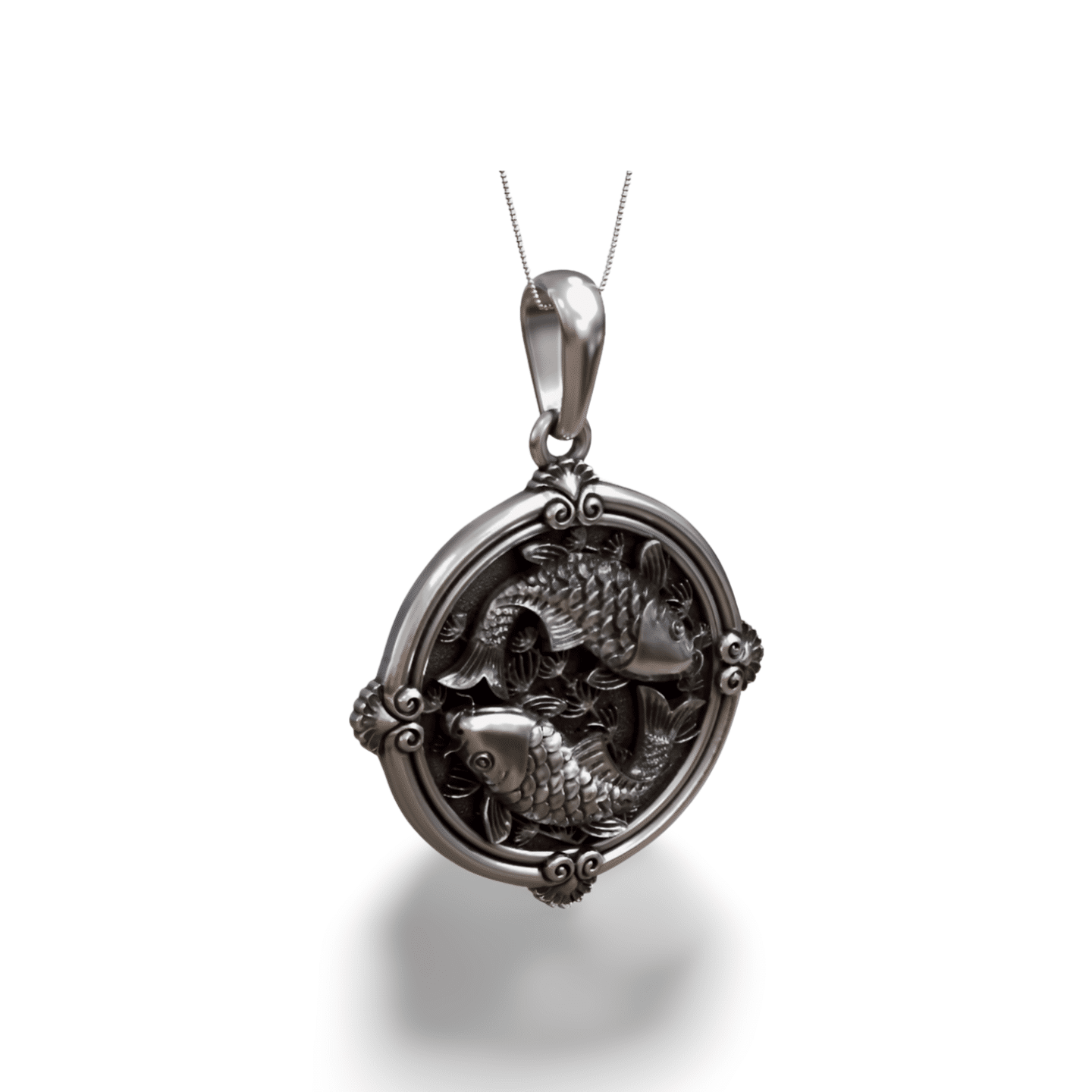 Koi Carp Fish Round 925 Silver Pendant for Men & Women, a detailed koi carp pendant crafted in silver, featuring two koi swimming in harmony inside an ornate circular frame. Perfect symbolic jewelry representing balance, strength and prosperity.